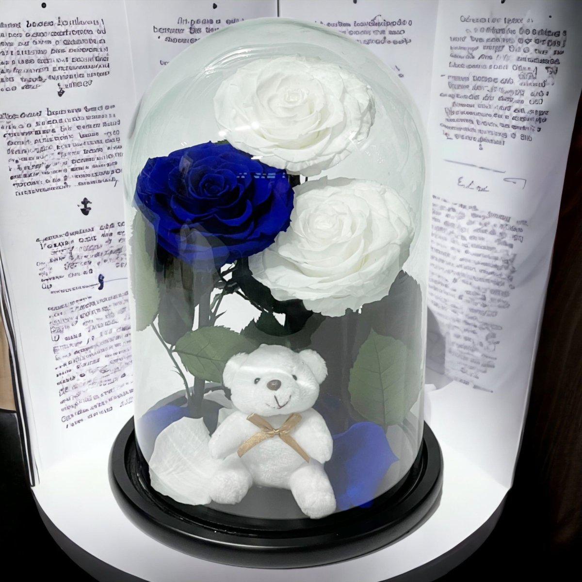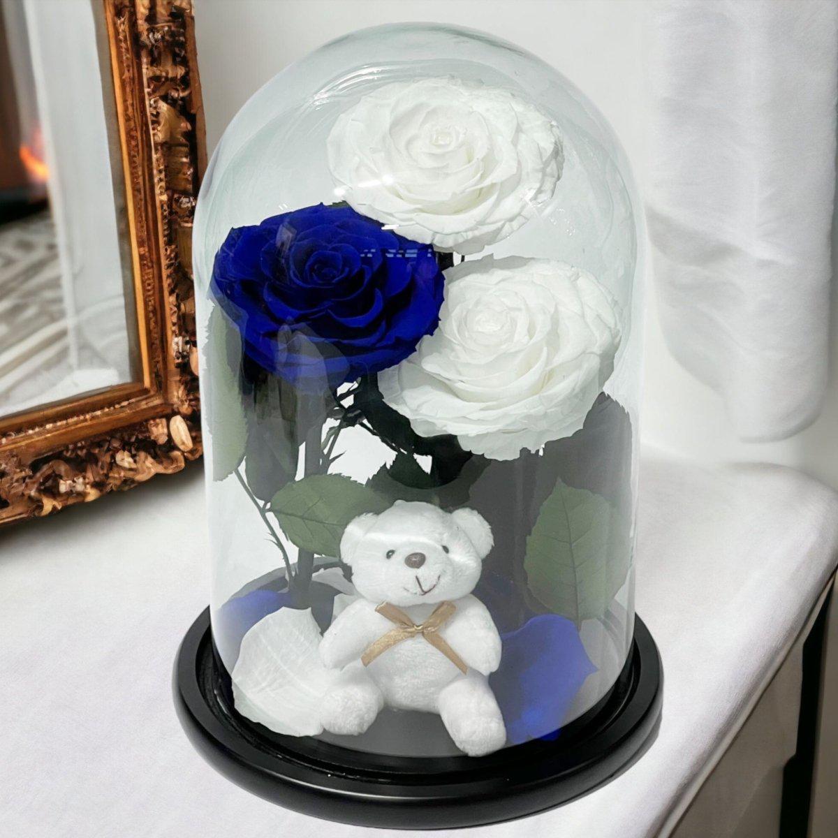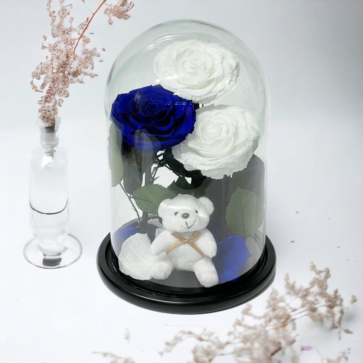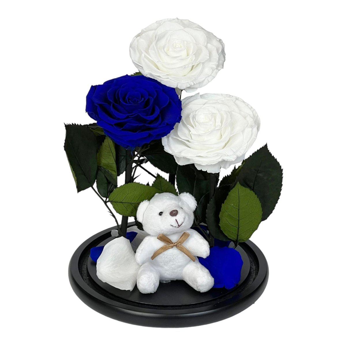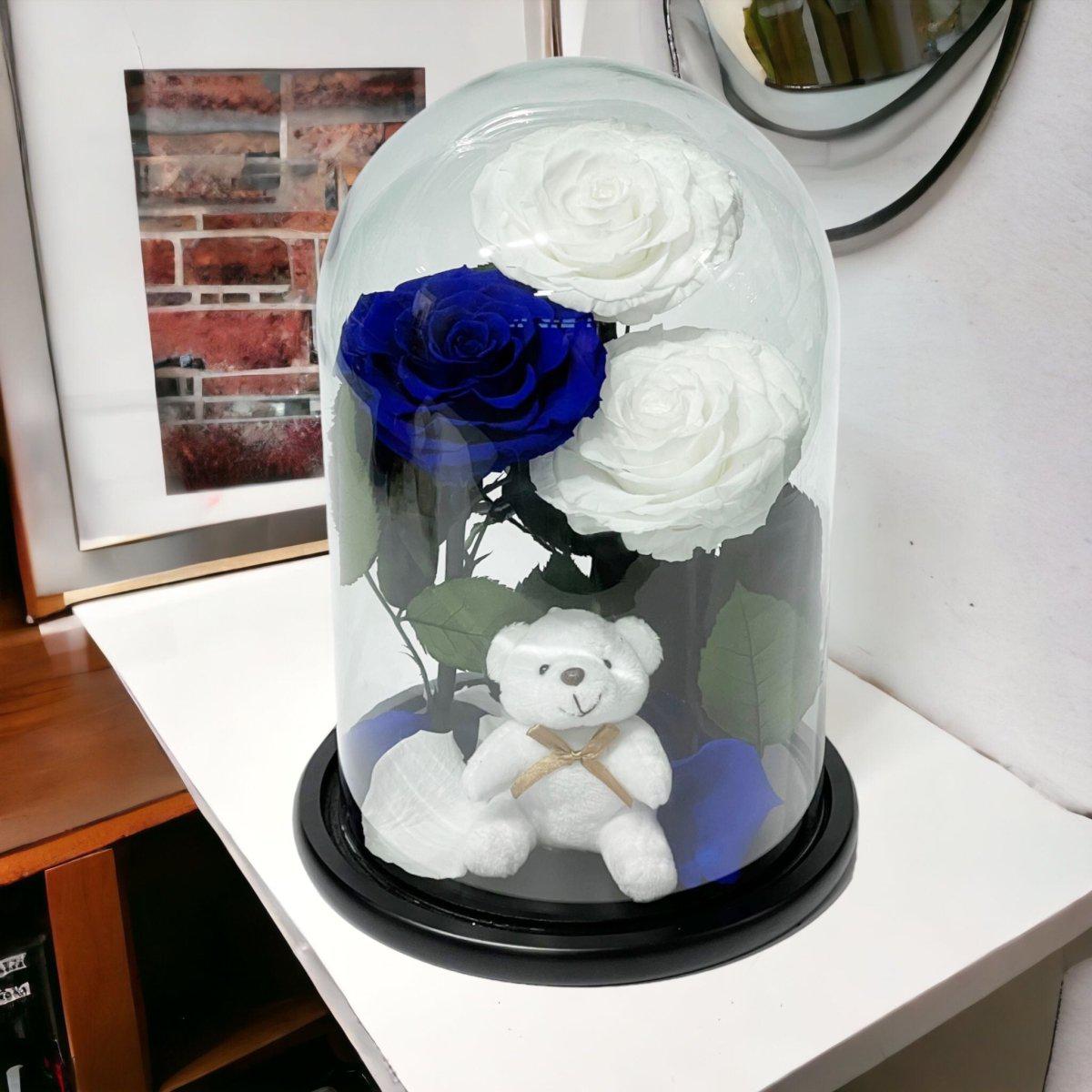 3 Trandafiri Criogenati 2 Albi 1 Albastru În Cupolă De Sticlă Cu Ursuleț Pluș