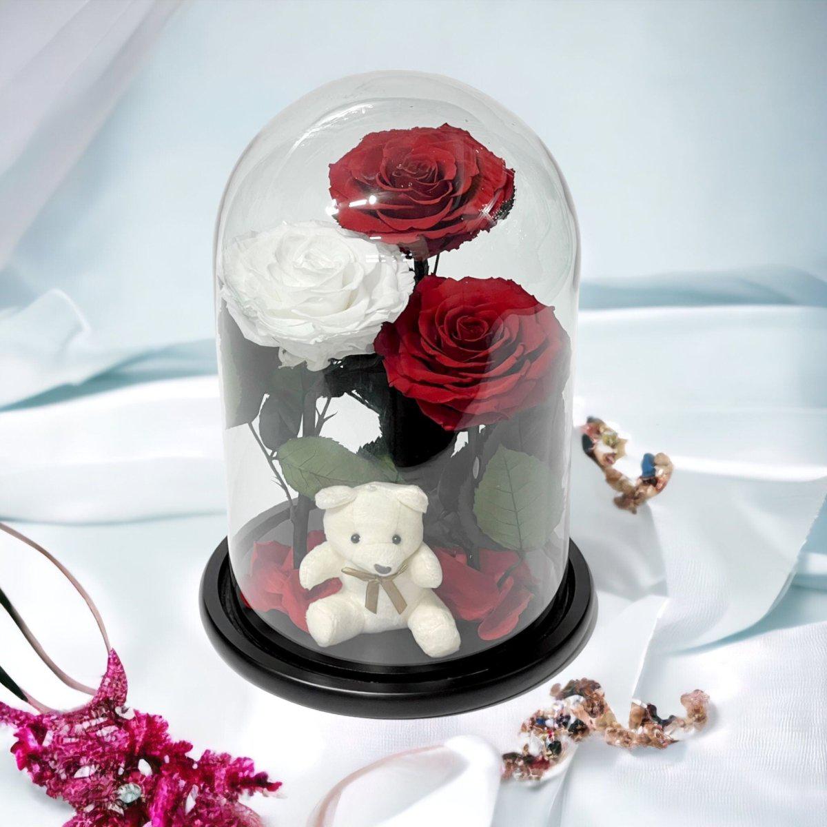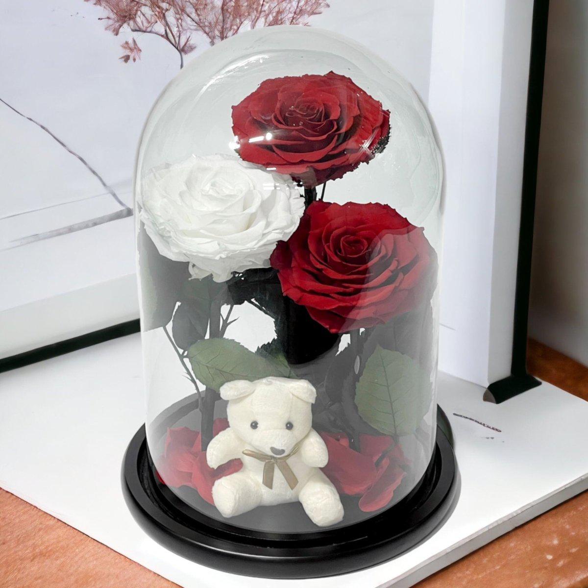 Trandafiri Criogenati Magnifici In Cupolă De Sticlă Cu 3 Flori 2 Roșii Și 1 Alb