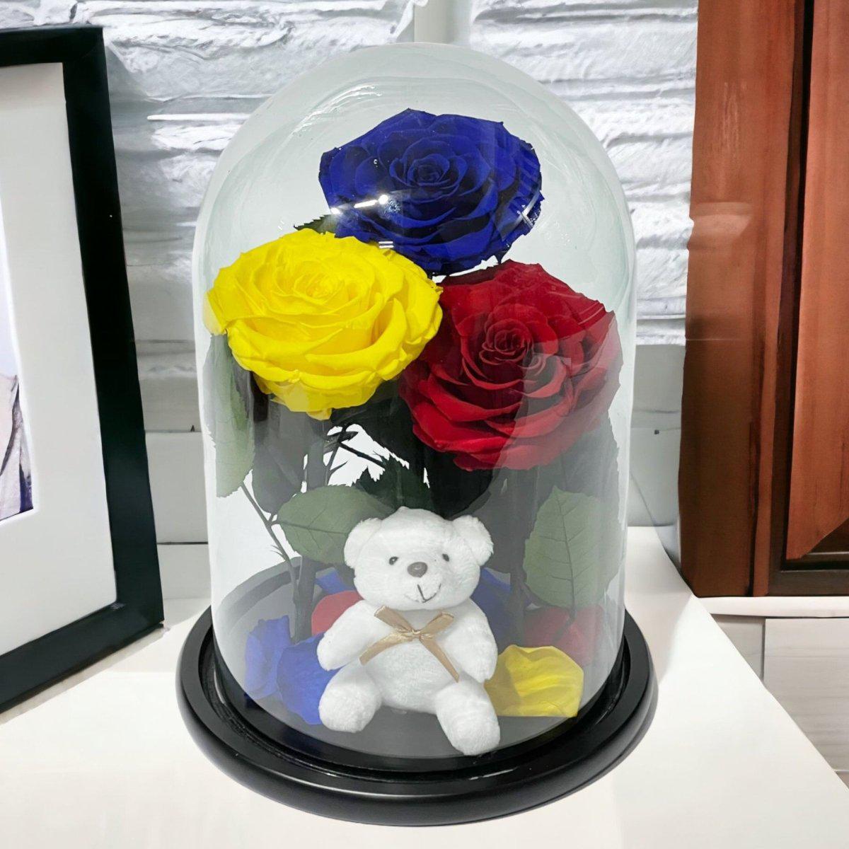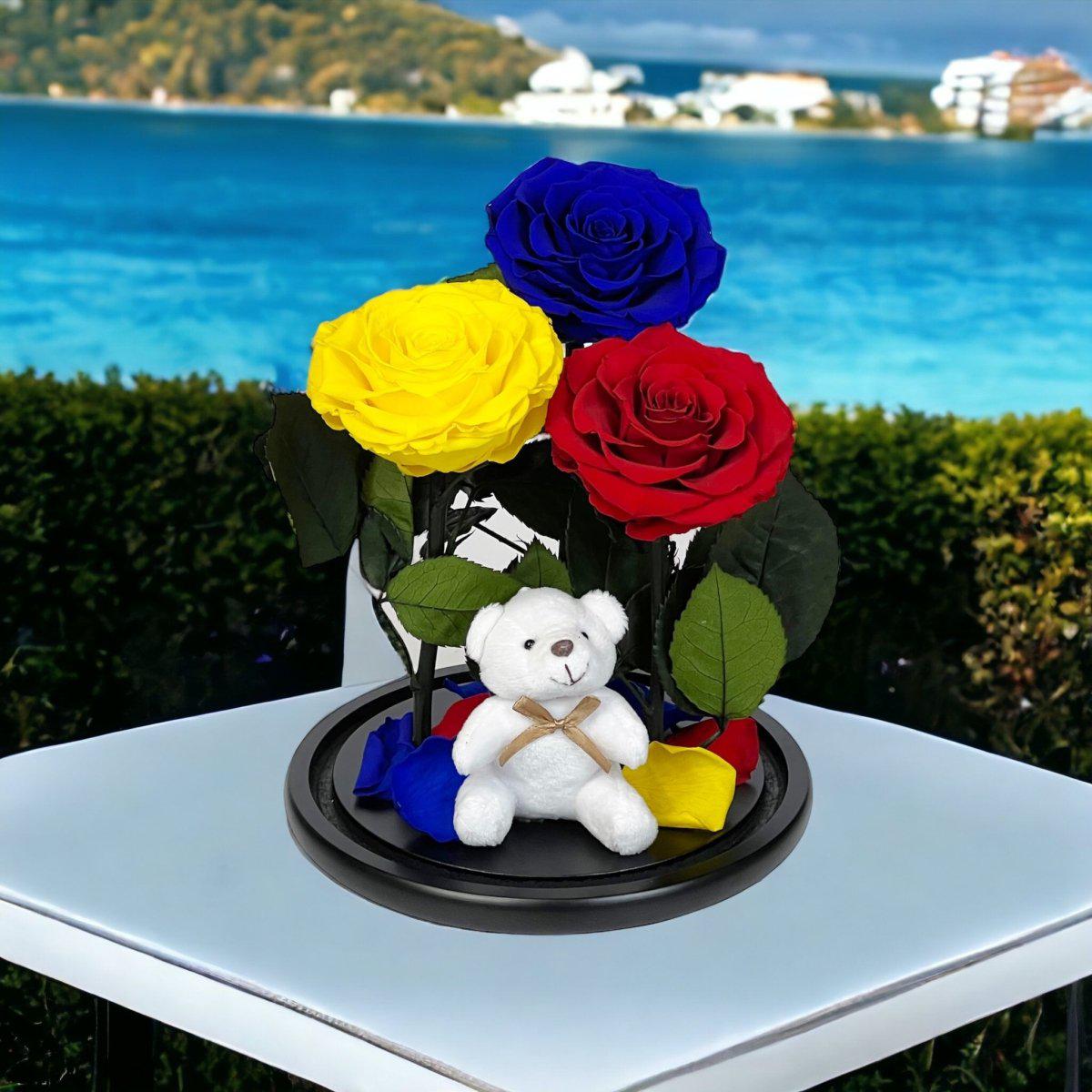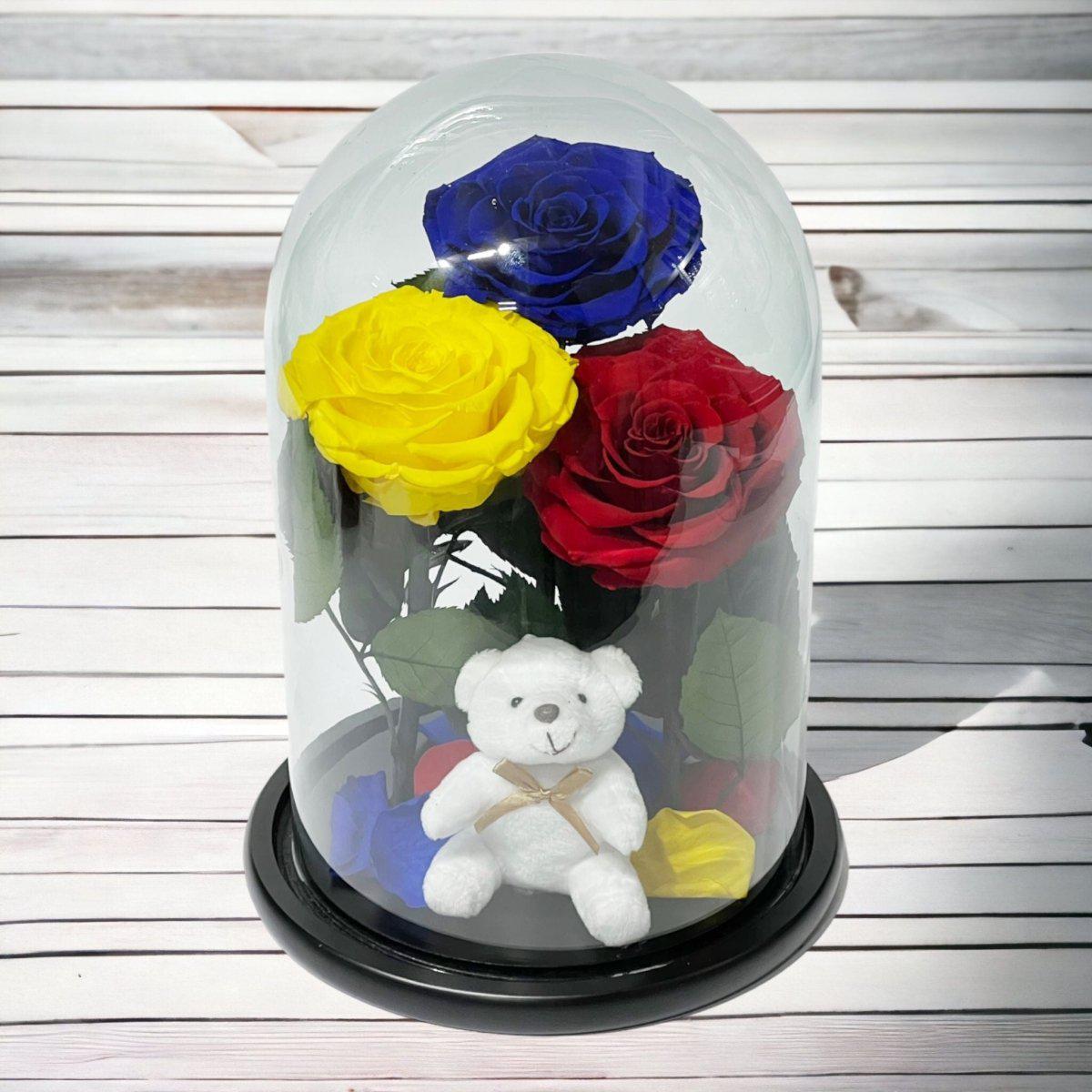 Detalii despre produs: Aranjament cu 3 trandafiri criogenati mari (1 albastru, 1 galben, 1 roșu), Cupola de sticlă cu dimensiuni 20x35 cm, Diametru floare 9–9,5 cm, Blat din lemn negru, Ursuleț din plus inclus.