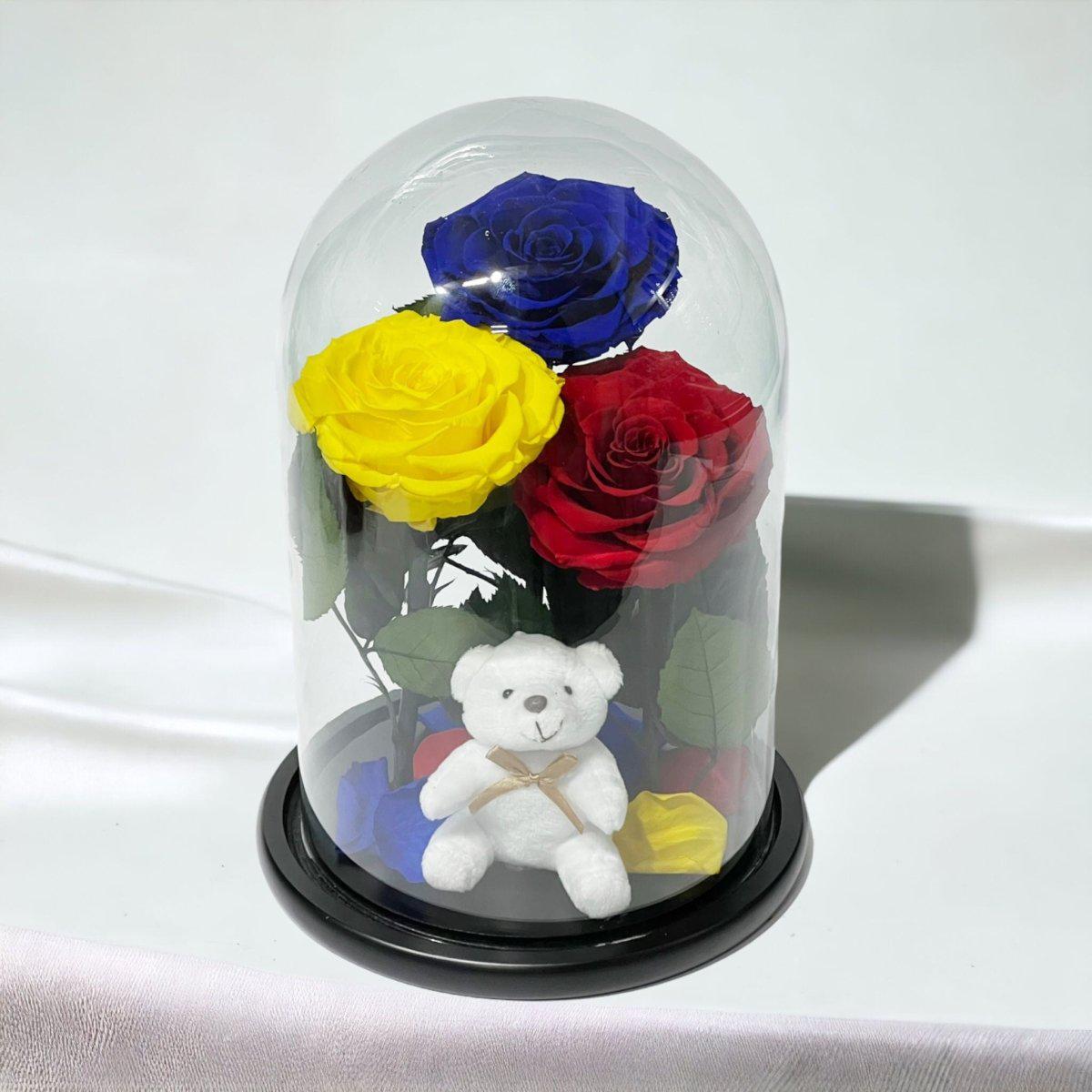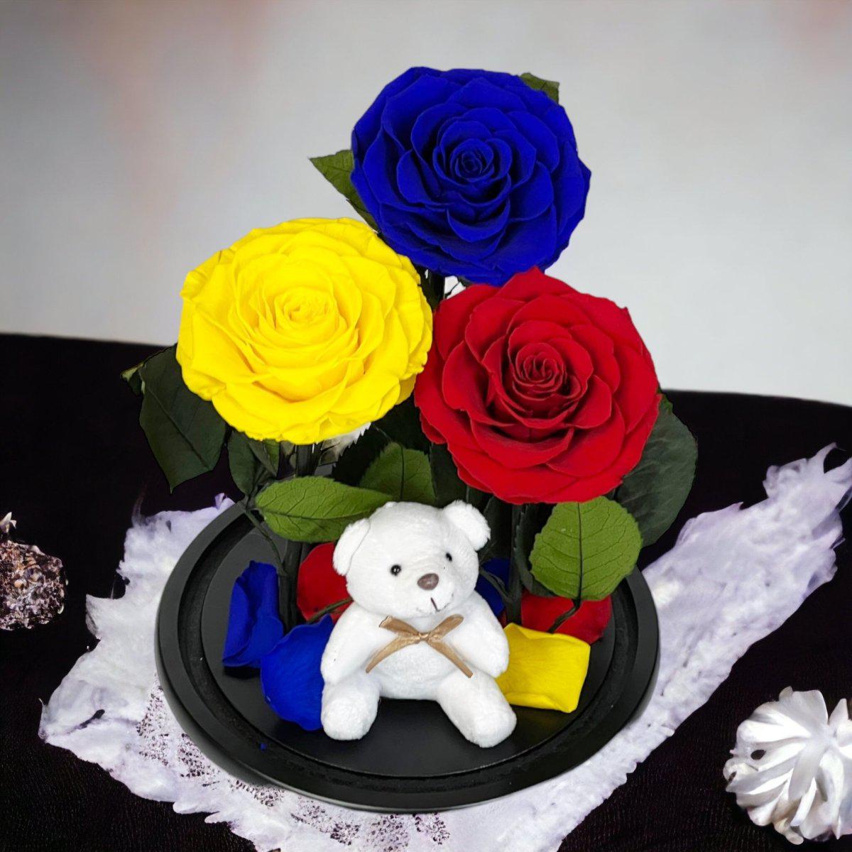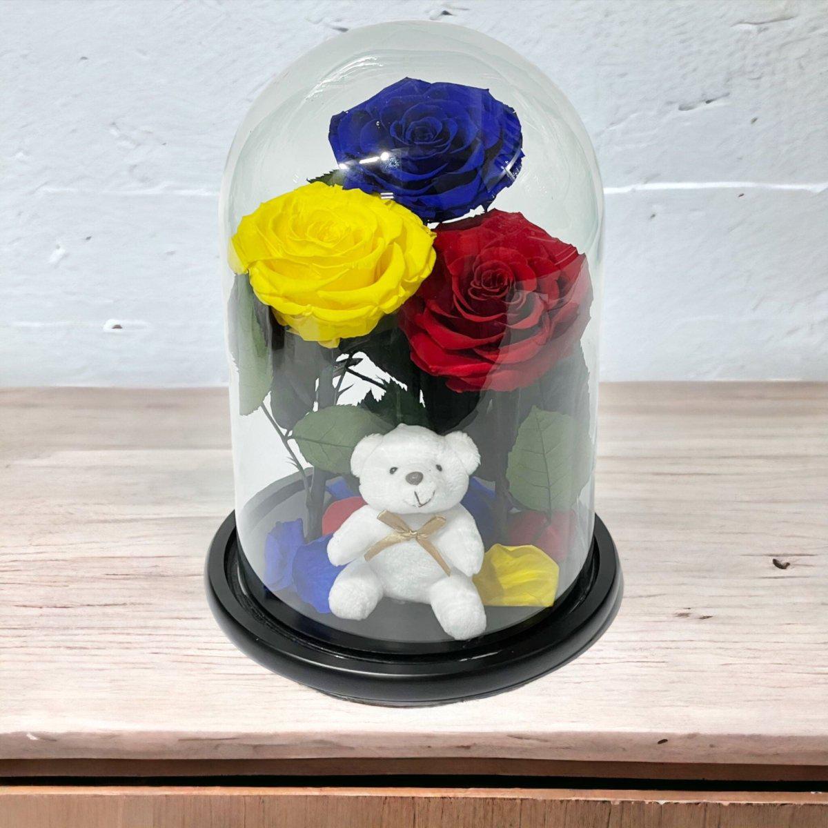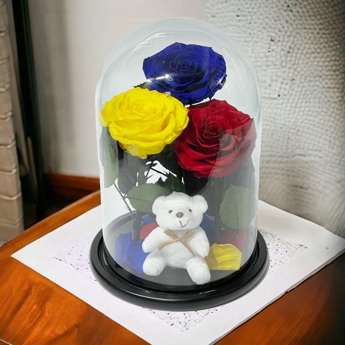 Detalii despre produs: Aranjament cu 3 trandafiri criogenati mari (1 albastru, 1 galben, 1 roșu), Cupola de sticlă cu dimensiuni 20x35 cm, Diametru floare 9–9,5 cm, Blat din lemn negru, Ursuleț din plus inclus.