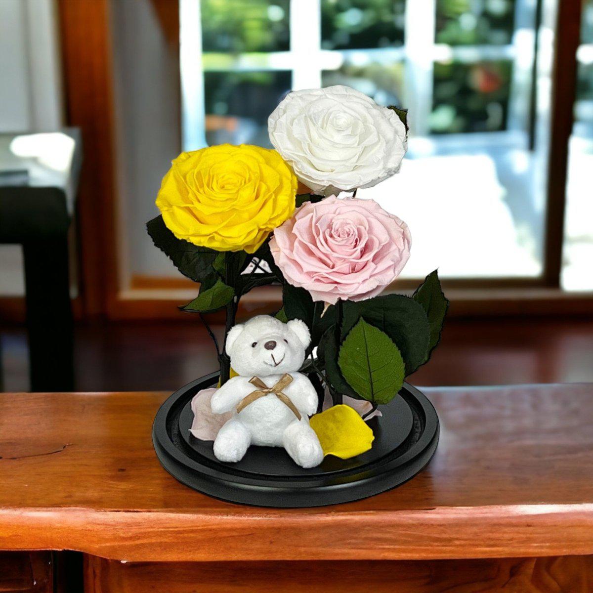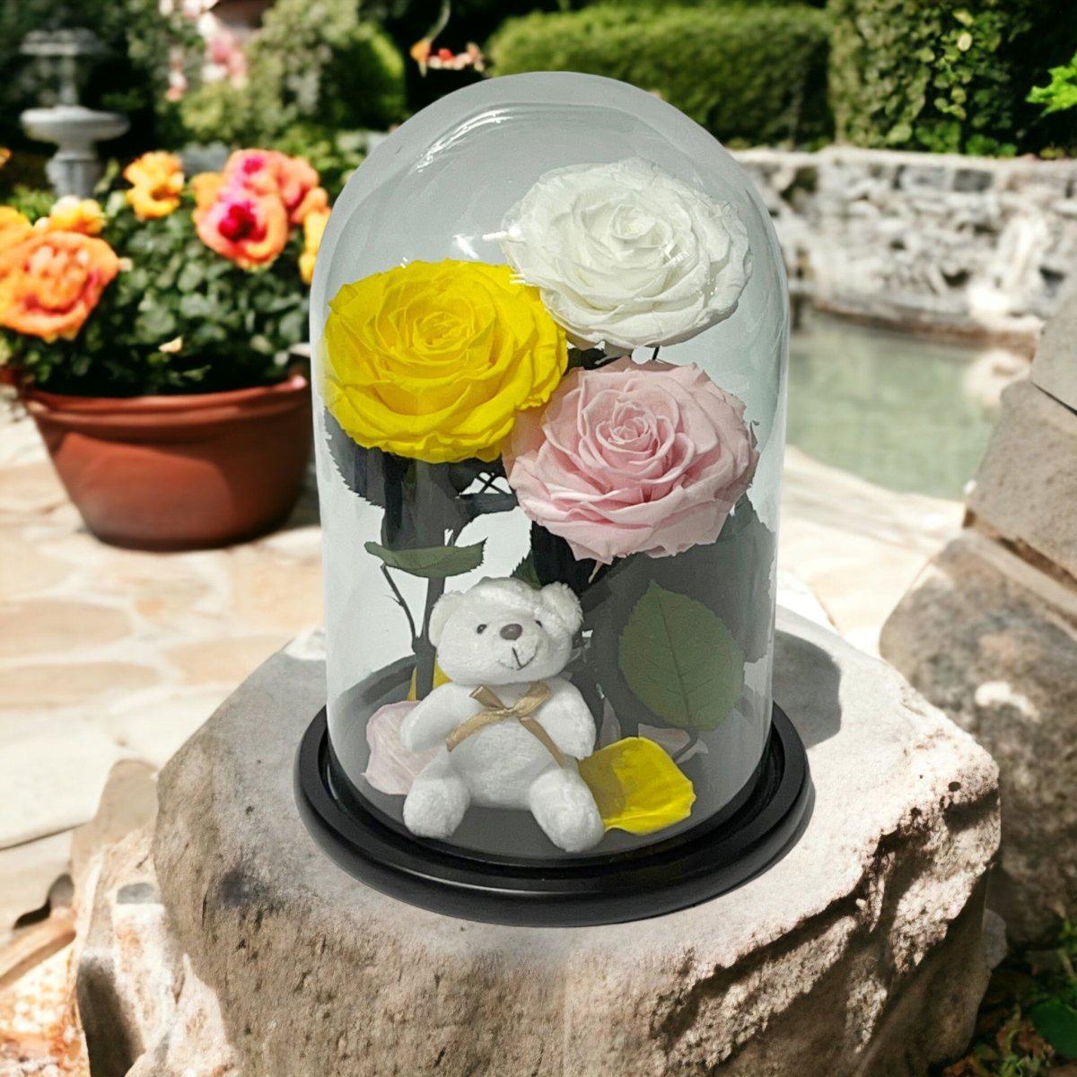 Set de Trandafiri Criogenati Mari Cupolă Sticlă Ursuleț Plush Galben Alb Roz