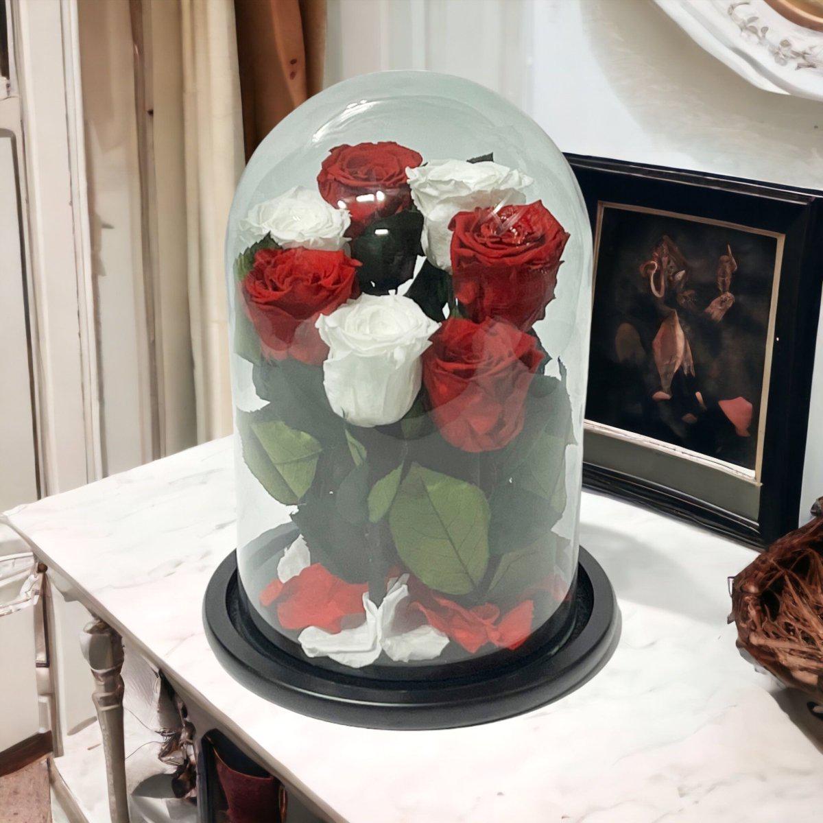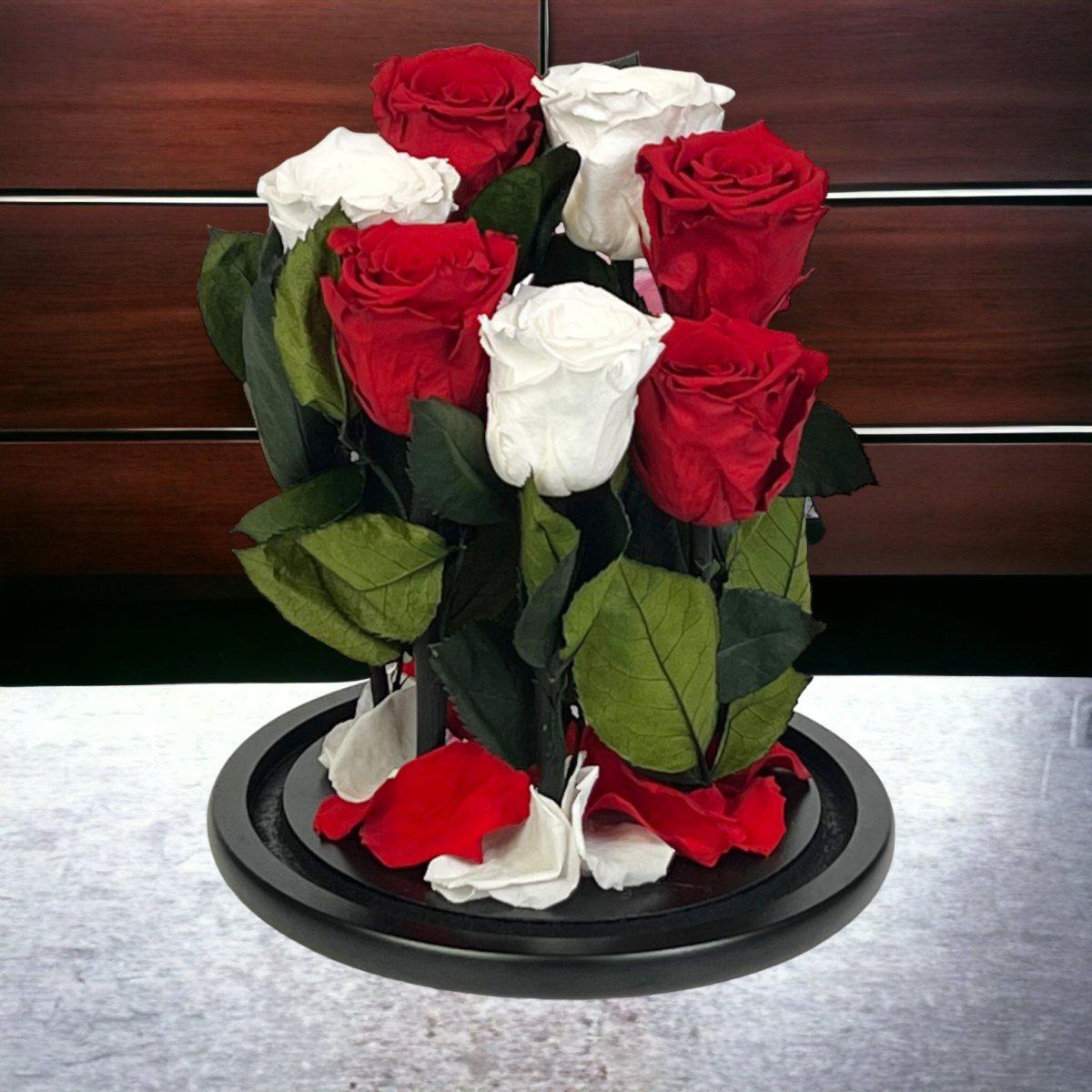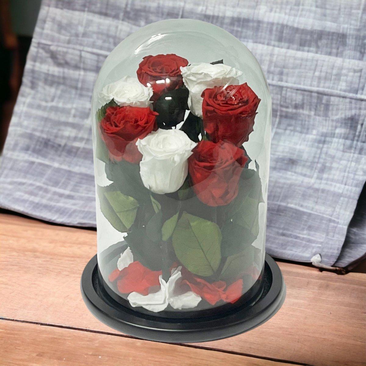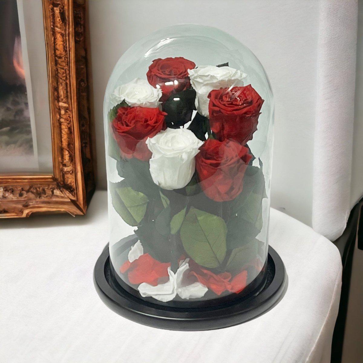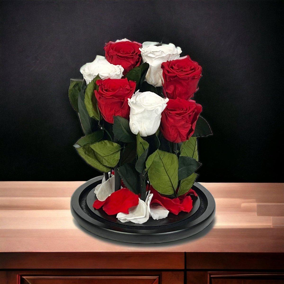 Îți prezentăm un cadou cu adevărat special: Aranjamentul cu 7 Trandafiri Criogenati - 4 roșii și 3 albi, în cupolă de sticlă, o operă de artă care transformă orice spațiu și emoții.