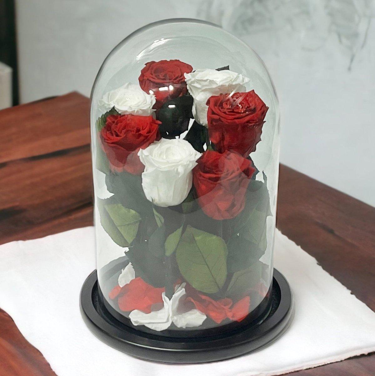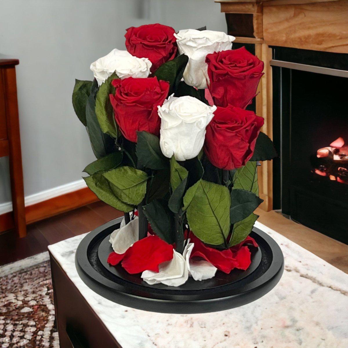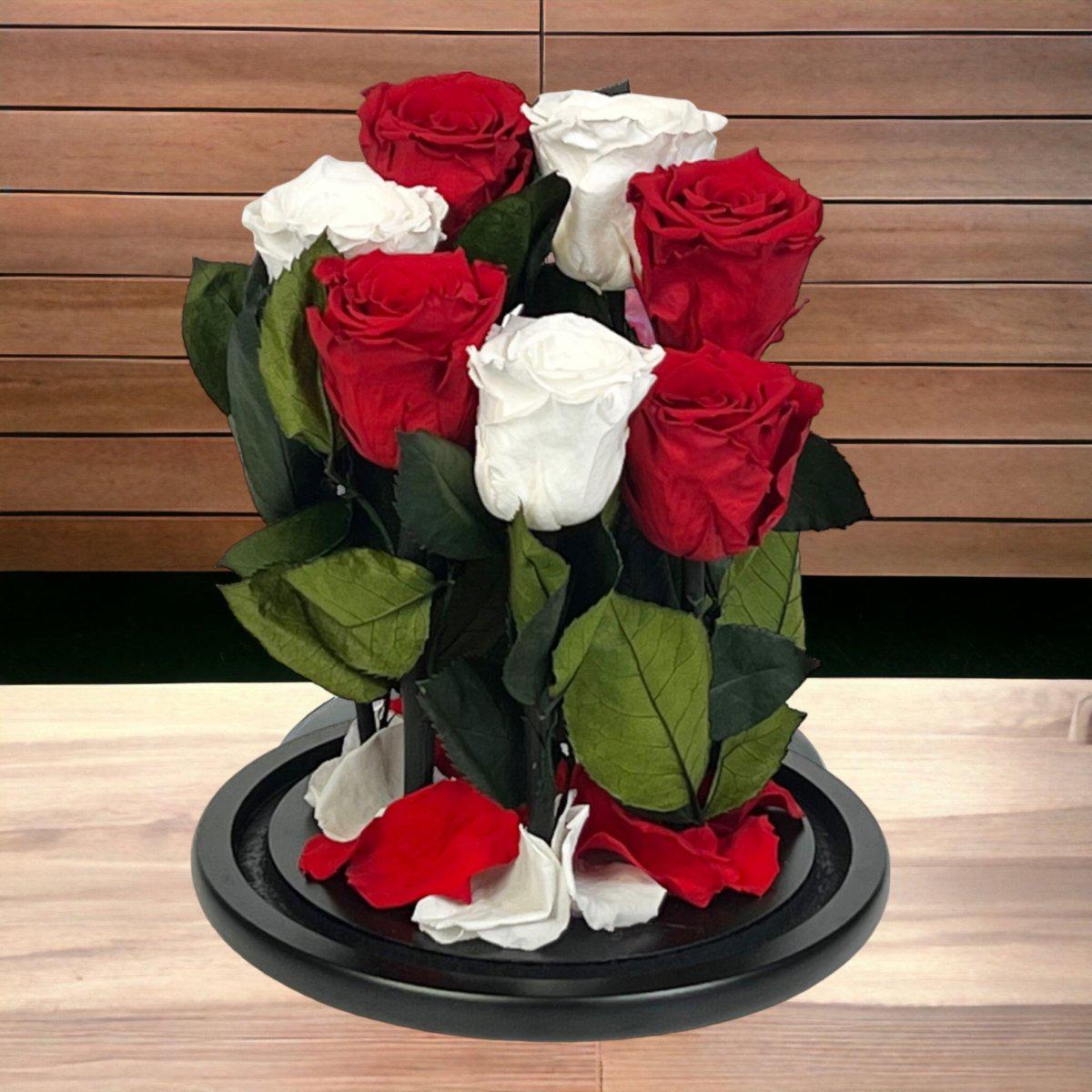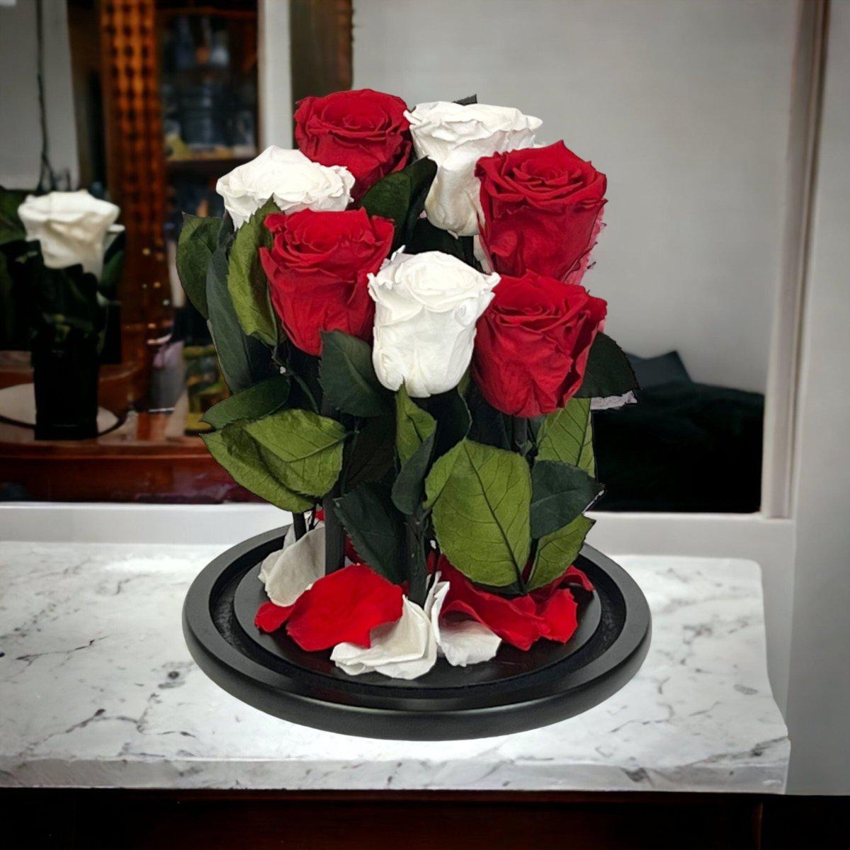 Îți prezentăm un cadou cu adevărat special: Aranjamentul cu 7 Trandafiri Criogenati - 4 roșii și 3 albi, în cupolă de sticlă, o operă de artă care transformă orice spațiu și emoții.