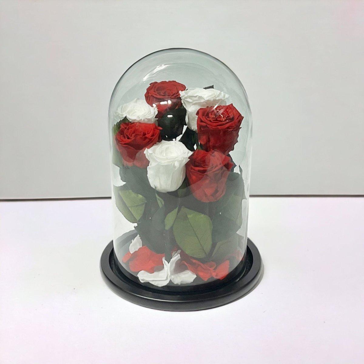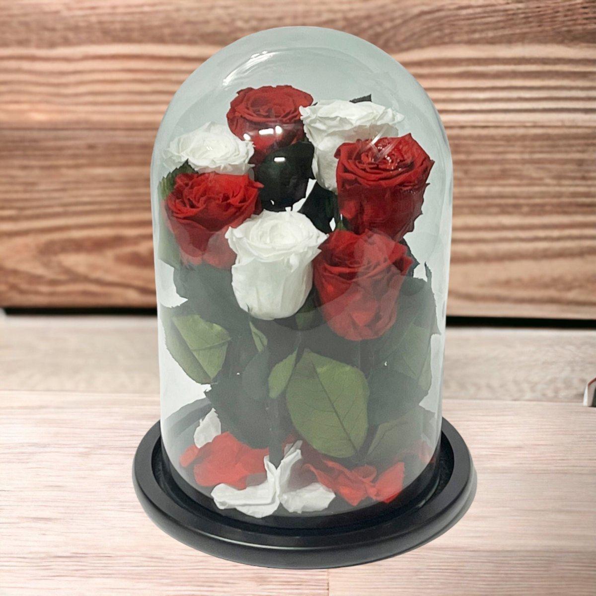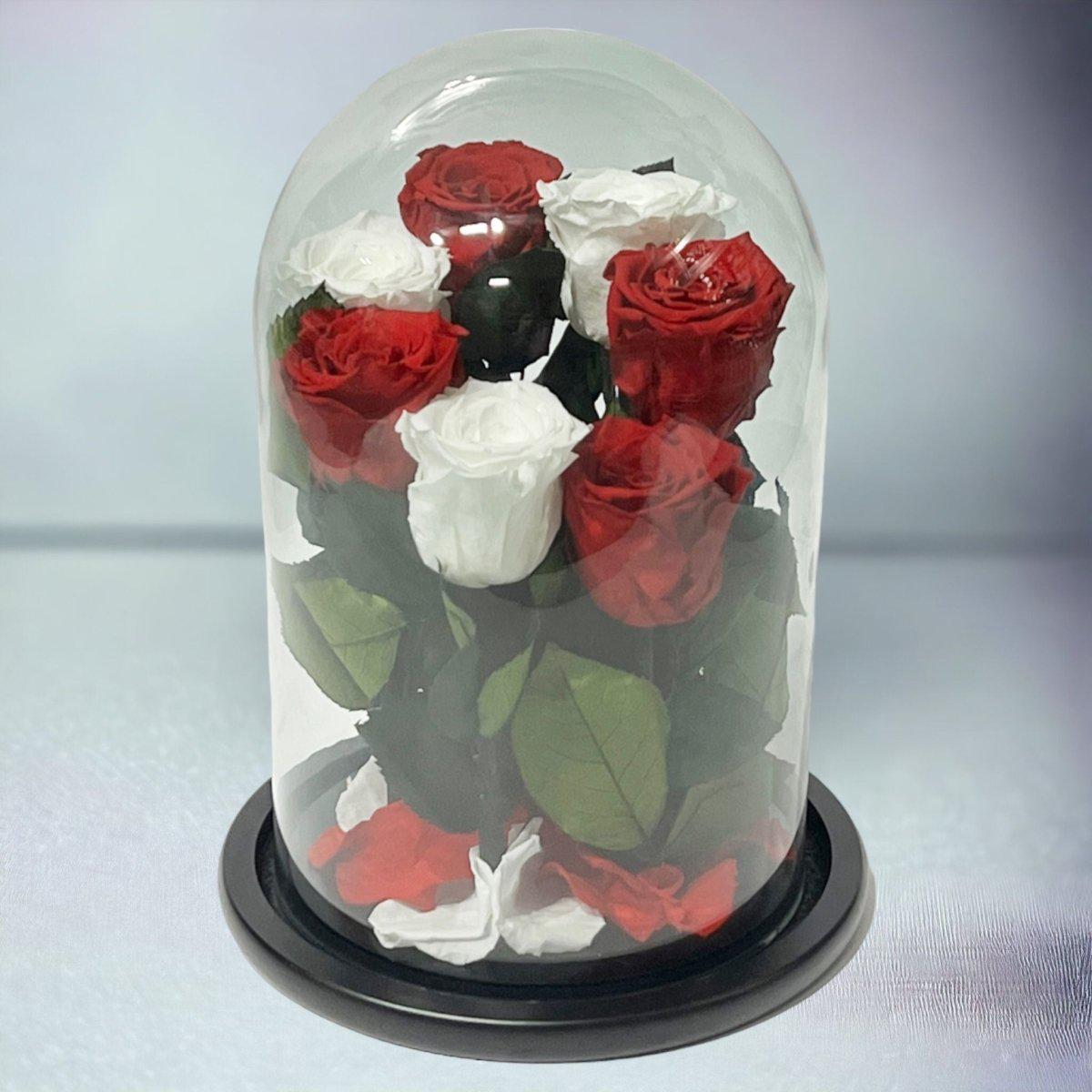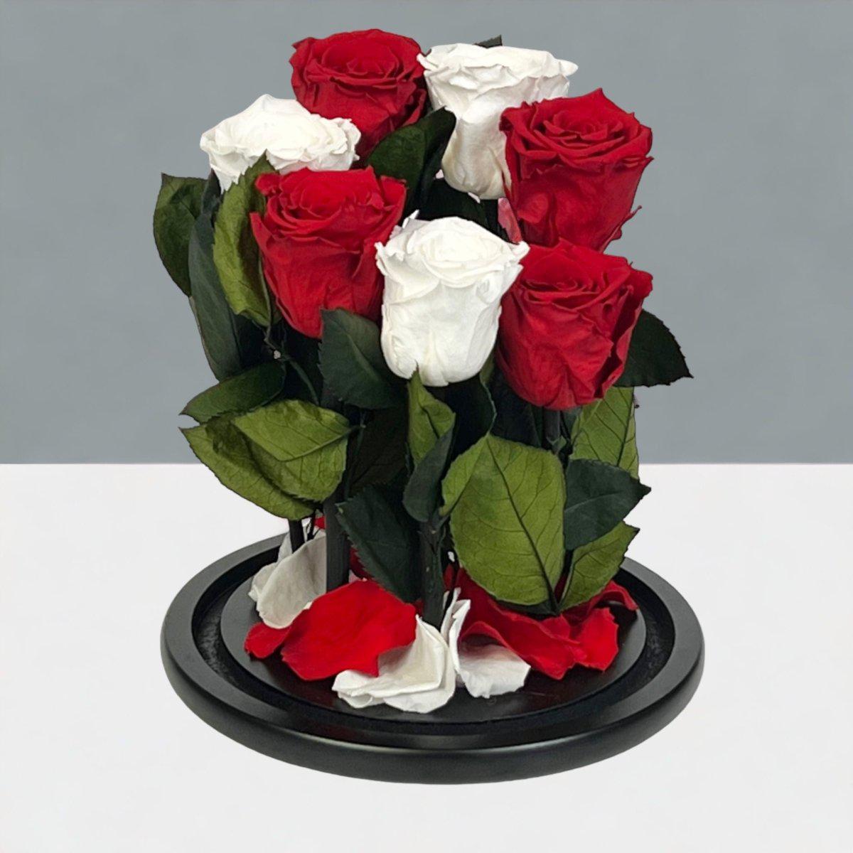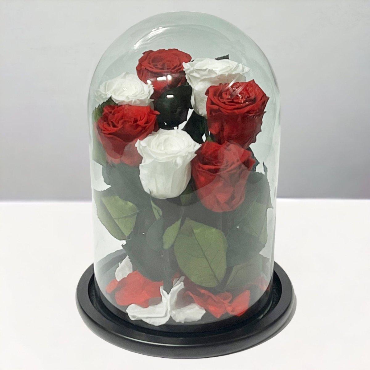 Îți prezentăm un cadou cu adevărat special: Aranjamentul cu 7 Trandafiri Criogenati - 4 roșii și 3 albi, în cupolă de sticlă, o operă de artă care transformă orice spațiu și emoții.