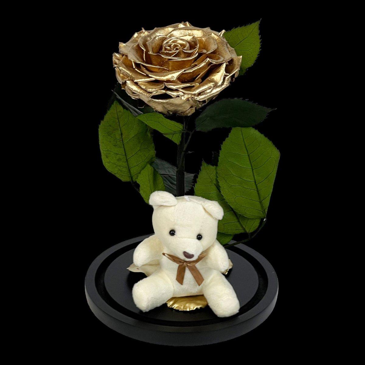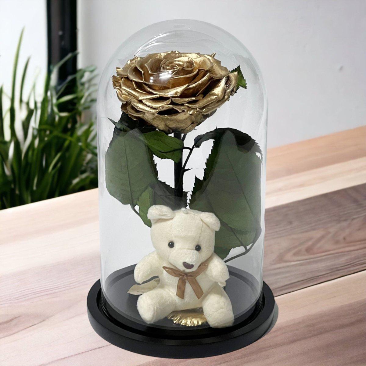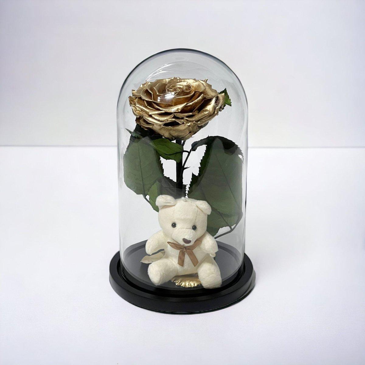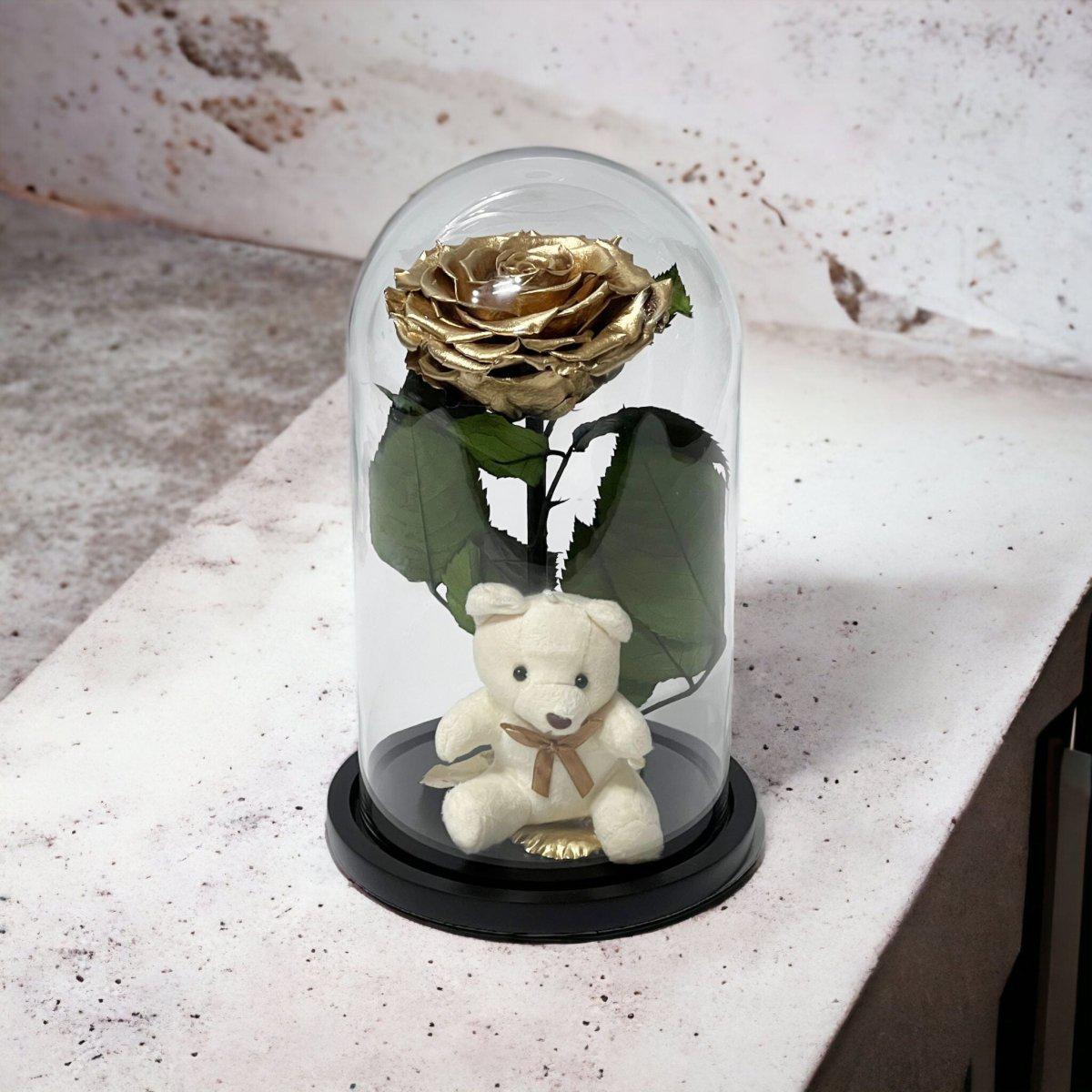 Trandafir Criogenat Bonita Auriu Cu Cupolă De Sticlă Și Ursuleț De Plus 9 9,5 Cm