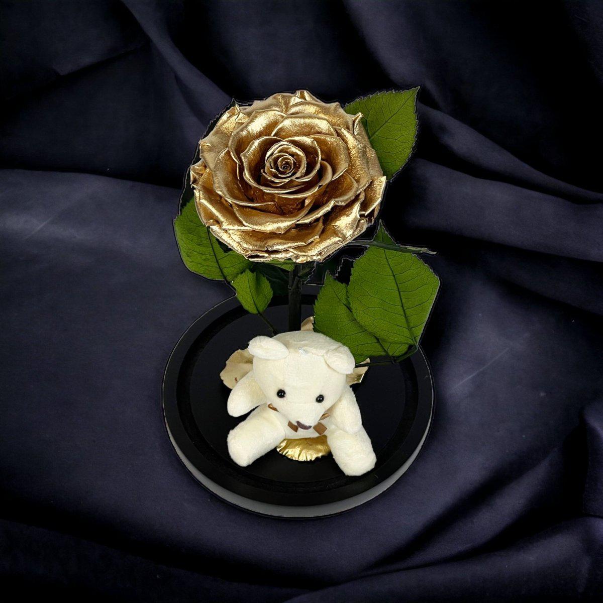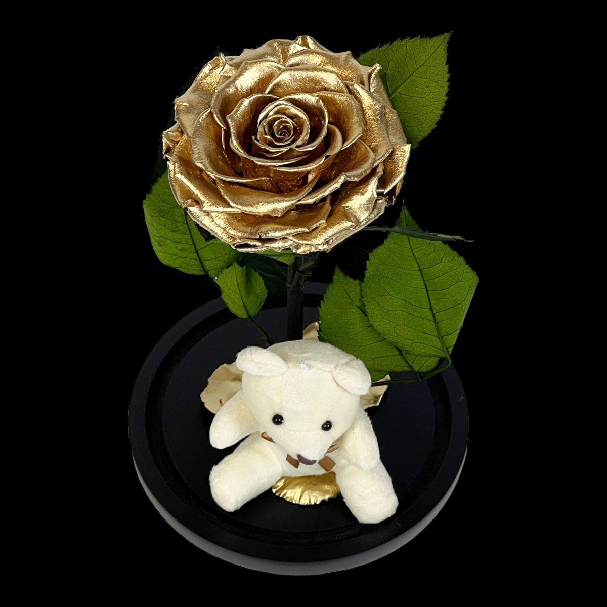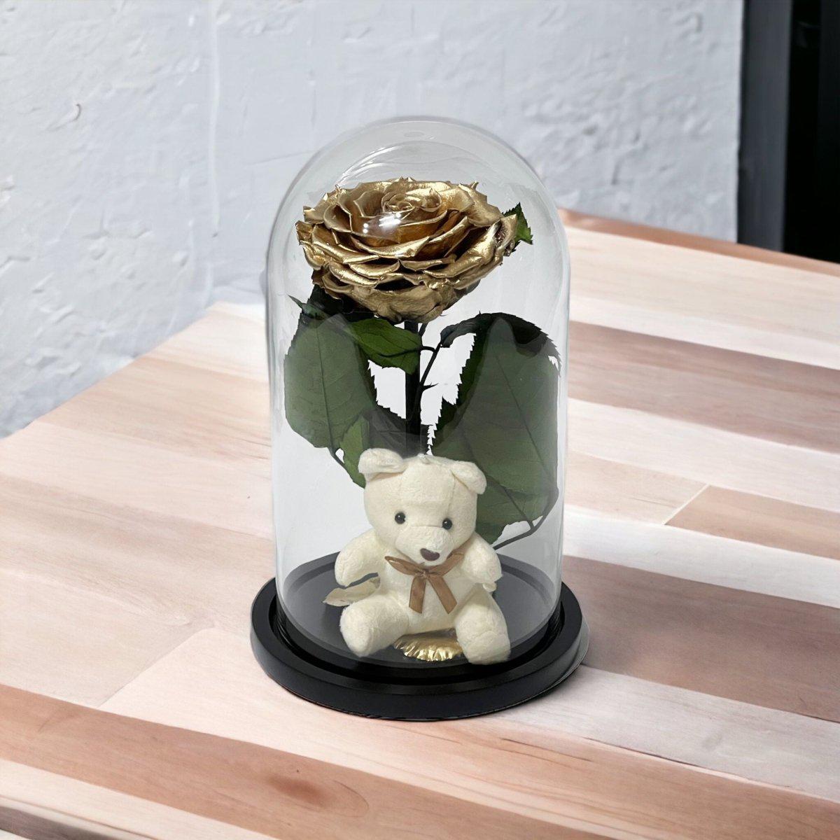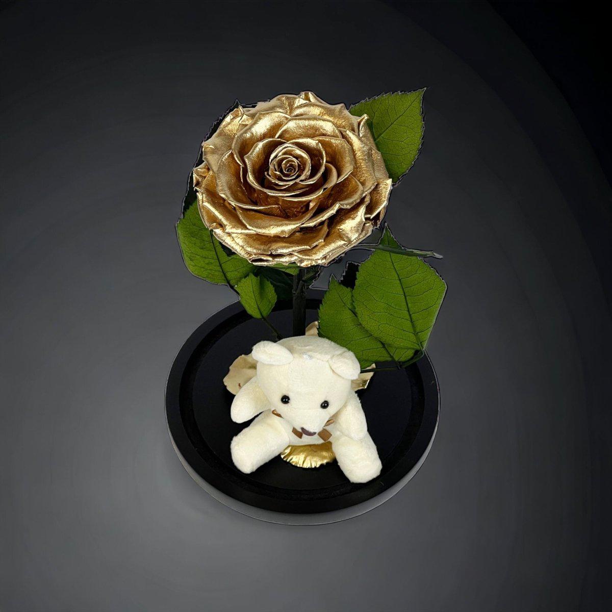 Trandafir Criogenat Bonita Auriu Cu Cupolă De Sticlă Și Ursuleț De Plus 9 9,5 Cm
