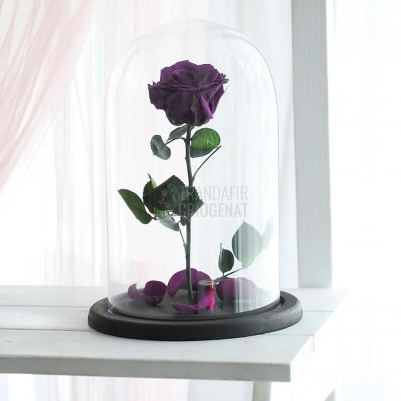 Culoare: mov-purpuriu | Dimensiune trandafir: diametru 6-6,5 cm | Cupolă: 12 x 25 cm | Cod produs: XL-PUR-02_2 | Personalizare: mesaj scris pe o plăcuță ovală din lemn, lipită la baza trandafirului, în interiorul cupolei.