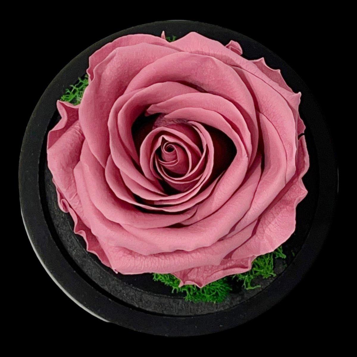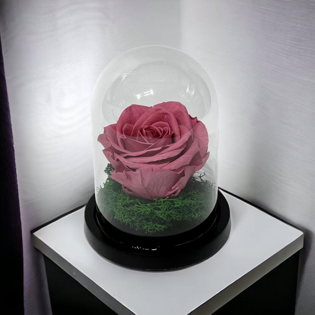 • Detalii premium: trandafir de 8 cm, expus într-o cupolă de sticlă elegantă de 10x15 cm, sprijinit de un suport din lemn rafinat.