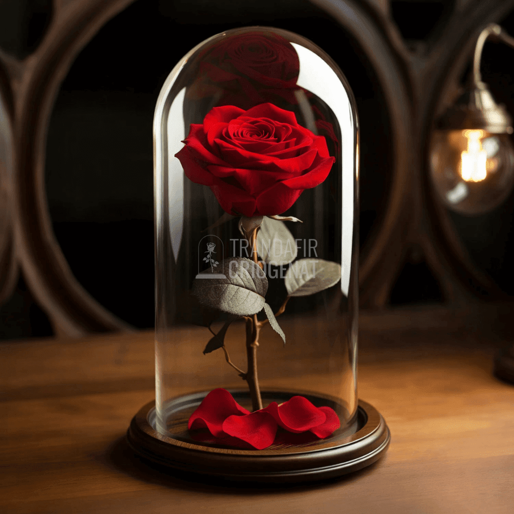 Trandafir Criogenat Roșu În Cupolă De Sticlă Personalizat Cu Mesaj Rezistent Până La 25 Ani