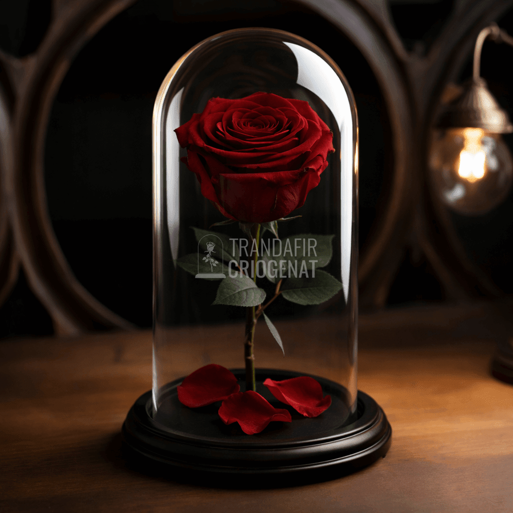 • Prezentare elegantă: cupola de sticlă protejează trăinicia florii, iar fundalul din lemn negru scoate în evidență culoarea intensă a trandafirului.