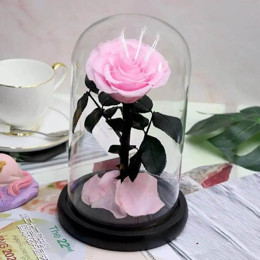 Descoperă Trandafirul Criogenat Roz Bella Încântă-ți simțurile și transformă orice spațiu într-un museu al frumuseții eterne. Îngrijit cu migală și așezat într-o cupolă de sticlă sofisticată, acest aranjament aduce natură pură și eleganță în casa sau biroul tău.