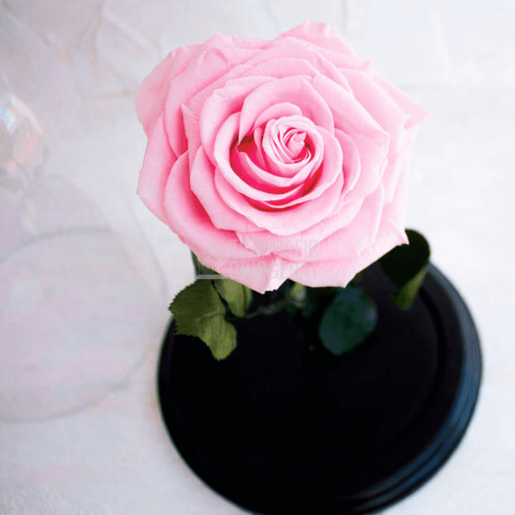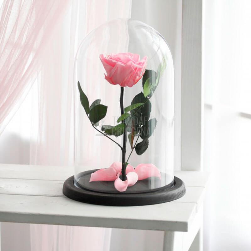 • Cupola de sticlă protejează trandafirul de praf și umiditate, menținând aspectul proaspăt ca în prima zi.