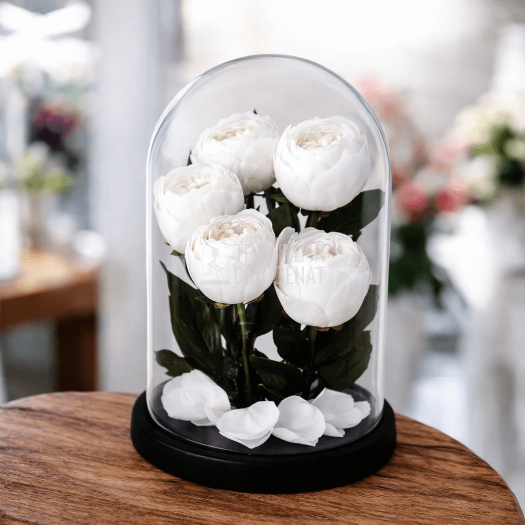 Cu această compoziție de 5 bujori criogenati albi în cupola de sticlă mare, fiecare detaliu este gândit pentru a oferi o experiență memorabilă, care rezistă în timp și spune povestea ta.