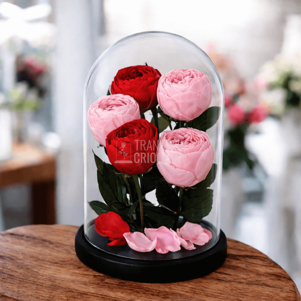Transformă momentele speciale în amintiri eterne cu acest set sofisticat: 5 bujori criogenati în cupolă de sticlă mare, în nuanțe romantic-energetice de roz și roșu. Oferă un efect elegant în orice spațiu, datorită cupolei generoase de 17x28 cm și a mesajului personalizat gravat pe plăcuța ovală de lemn, lipită la baza bujorilor.