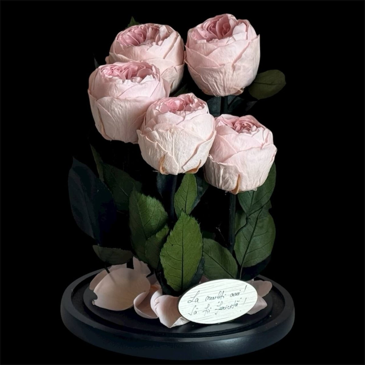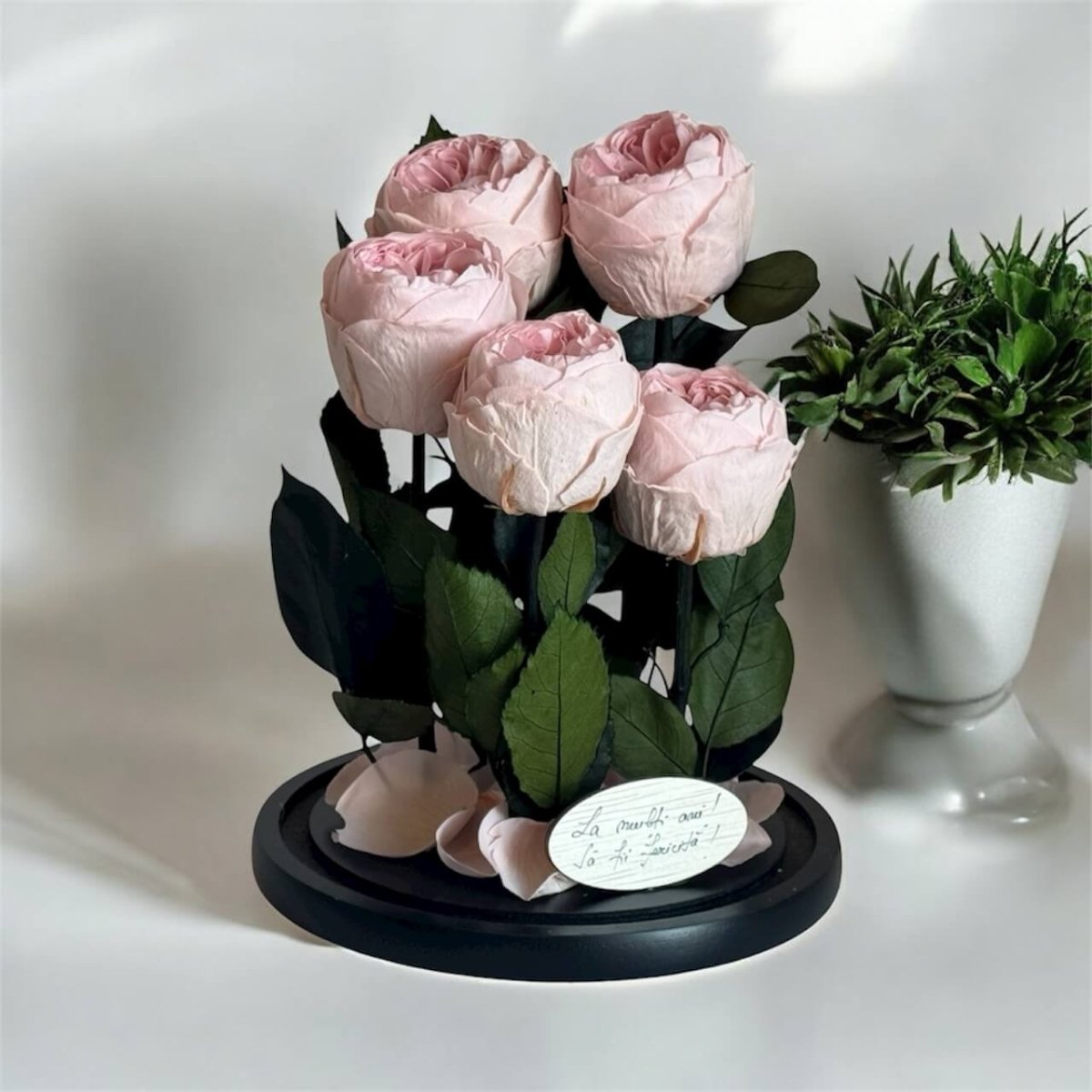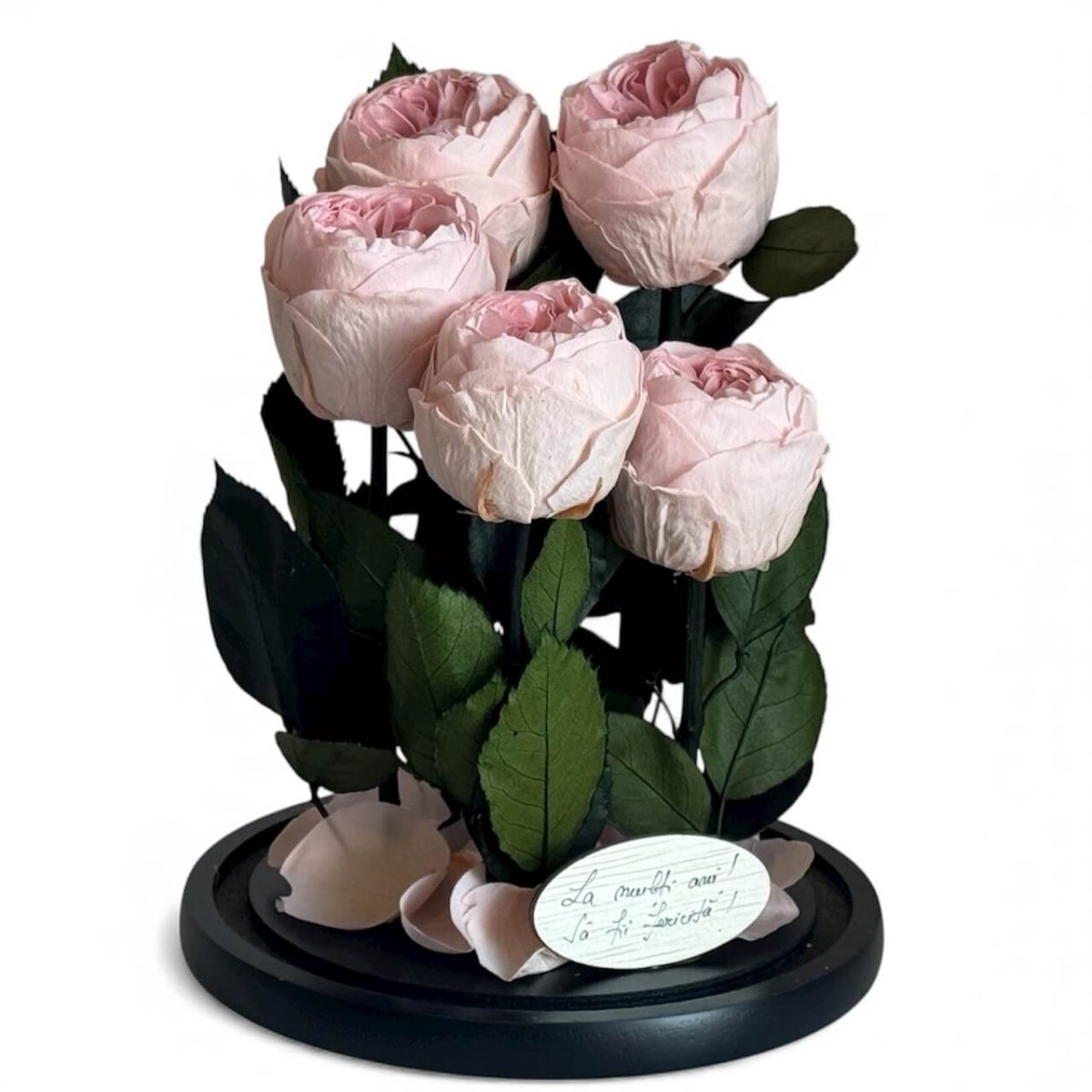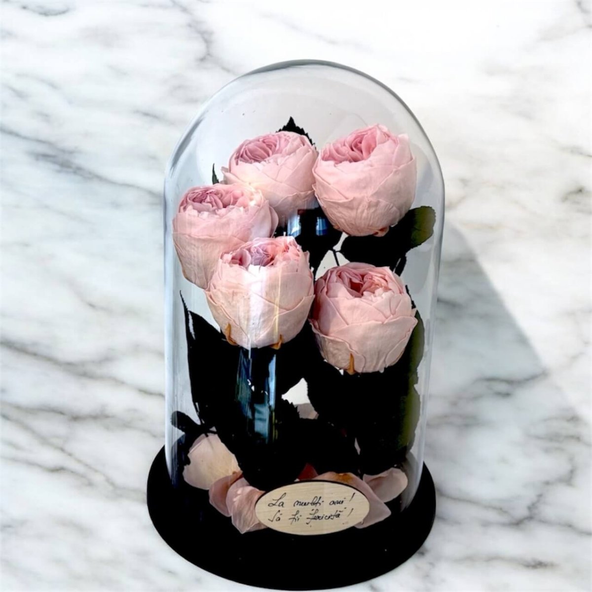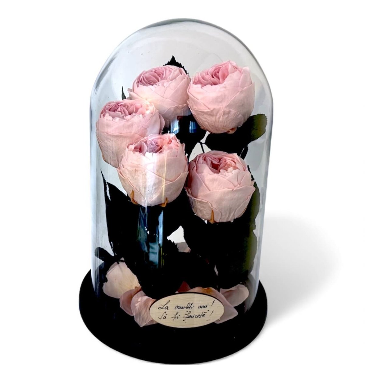 5 Bujori Criogenati roz Ø6-7cm in cupola mare de sticla 17x28cm (cu mesaj)
