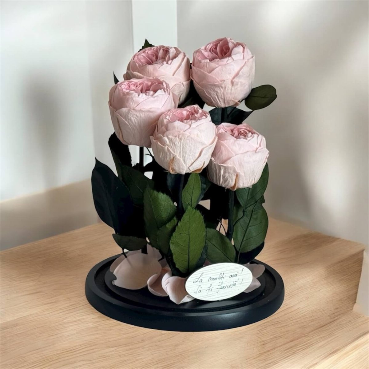 5 bujori criogenati rozcu diametrul de 10cm, in cupola de sticla de dimensiune 15x25cm, pe blat de lemnde culoare neagra.