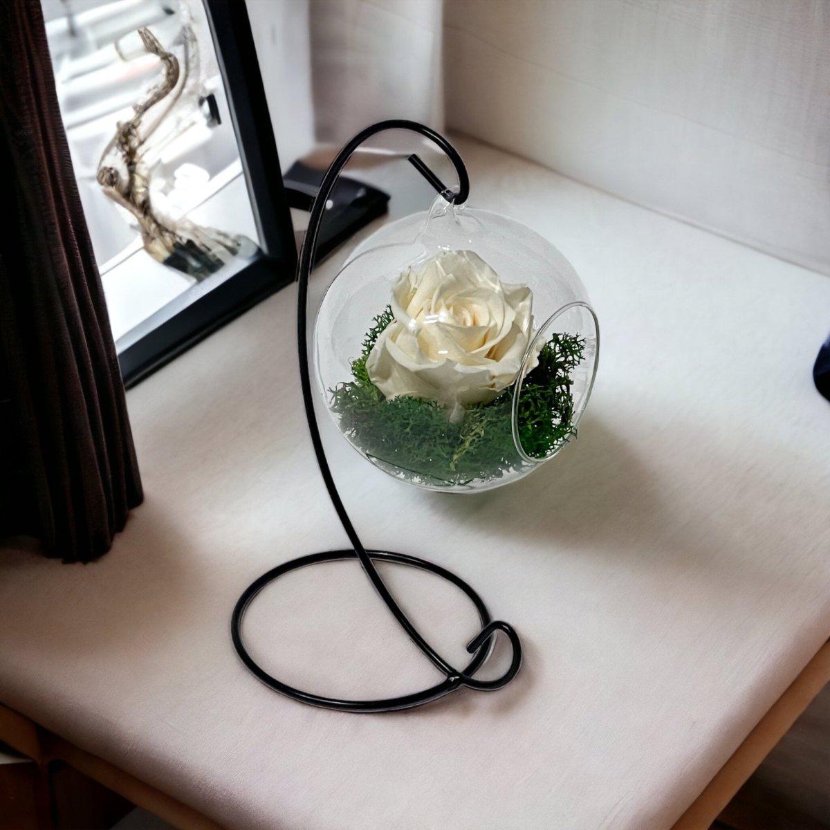Nu necesită întreținere și păstrează o prezență constantă în timp. Datorită procesului criogenic, trandafirul crem nu se usucă, nu se ofilește și nu necesită lumină sau apă, asigurând un aspect vizual constant ani la rând. Globul de sticlă suspendat, cu diametrul de 10 cm, adaugă un rafinament modern, iar nuanțele naturale sunt evidențiate de simetria designului.