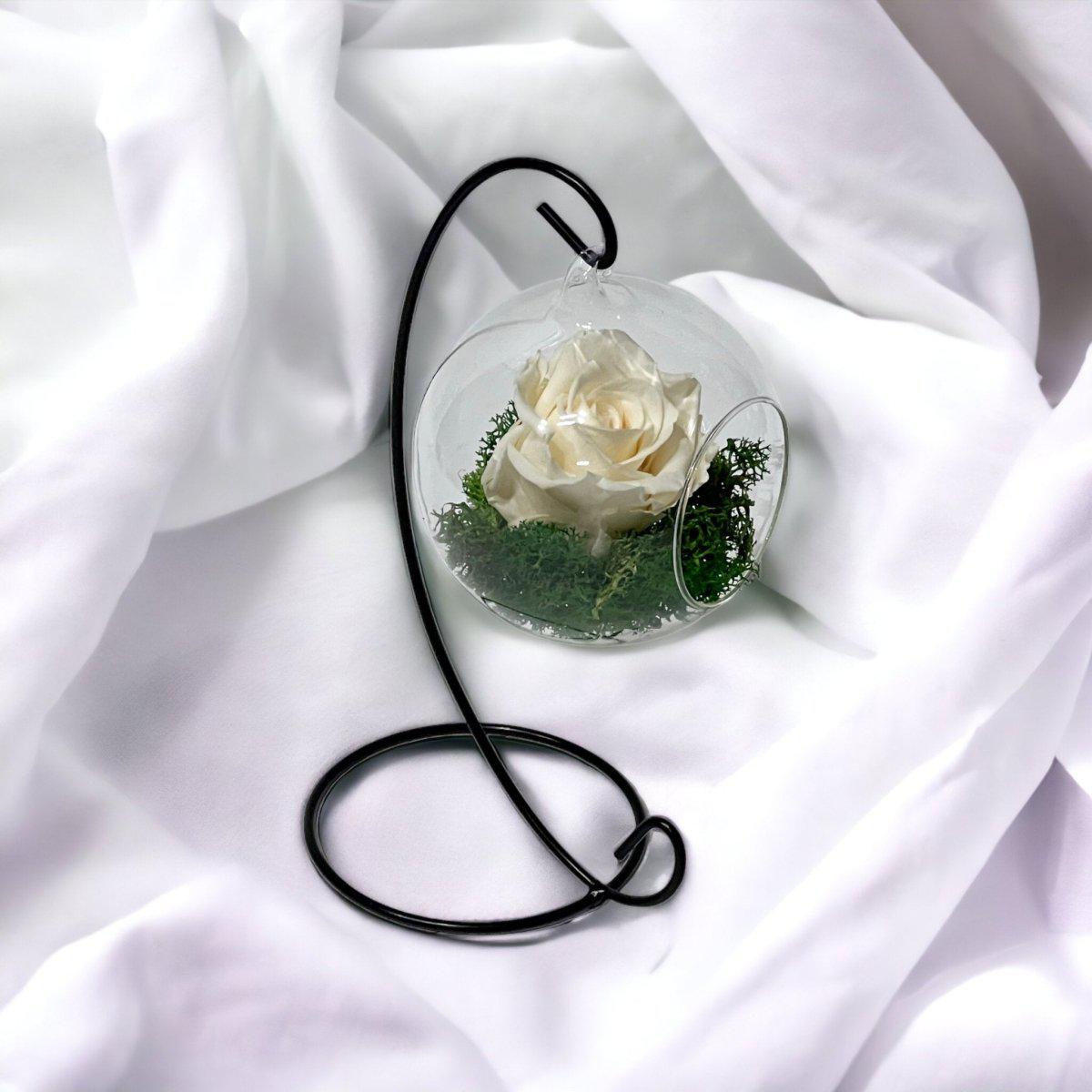 Trandafir criogenat în glob decorativ din sticlă suspendat, cu floarea crem, reprezintă o soluție estetică durabilă pentru spațiul dvs., cu diametrul globului de 10 cm și floarea având un diametru de aproximativ 6–6,5 cm.