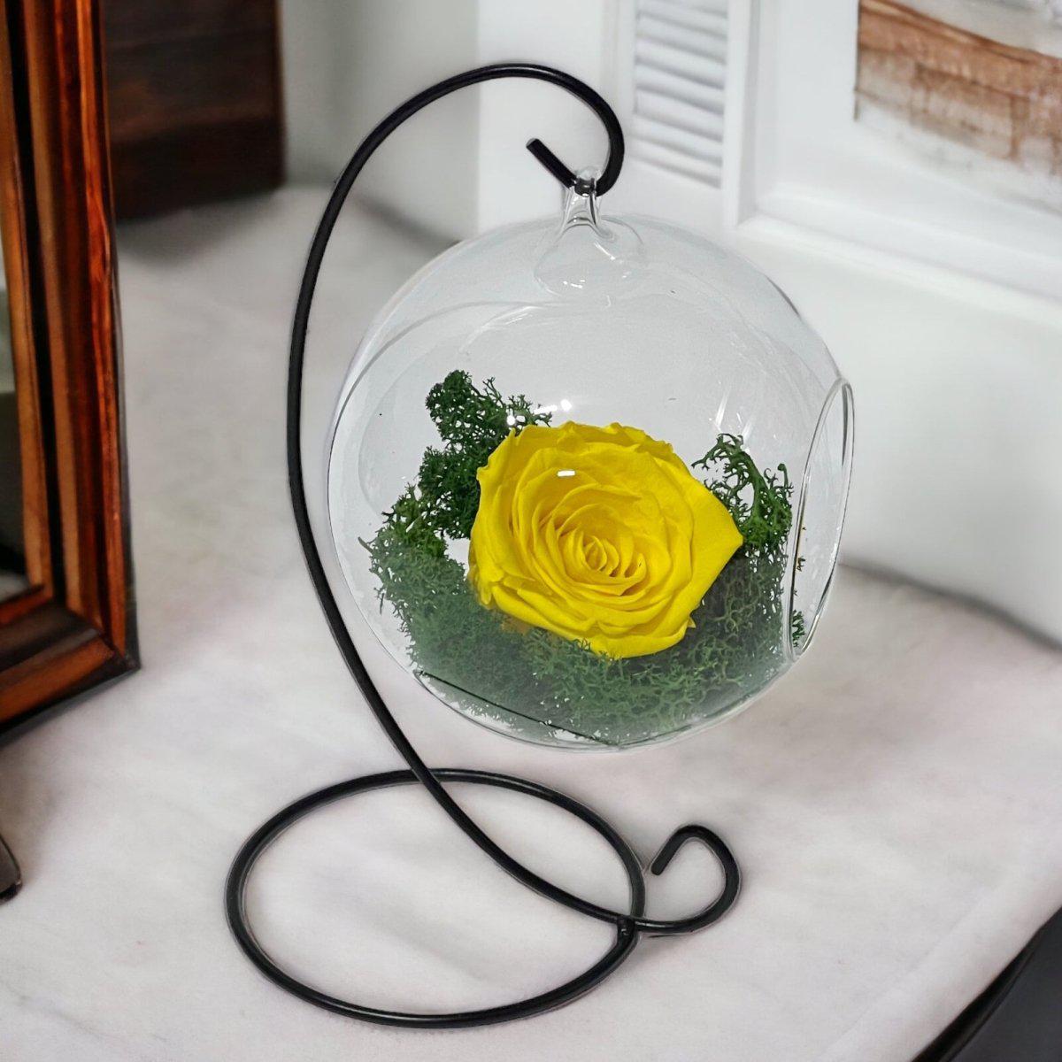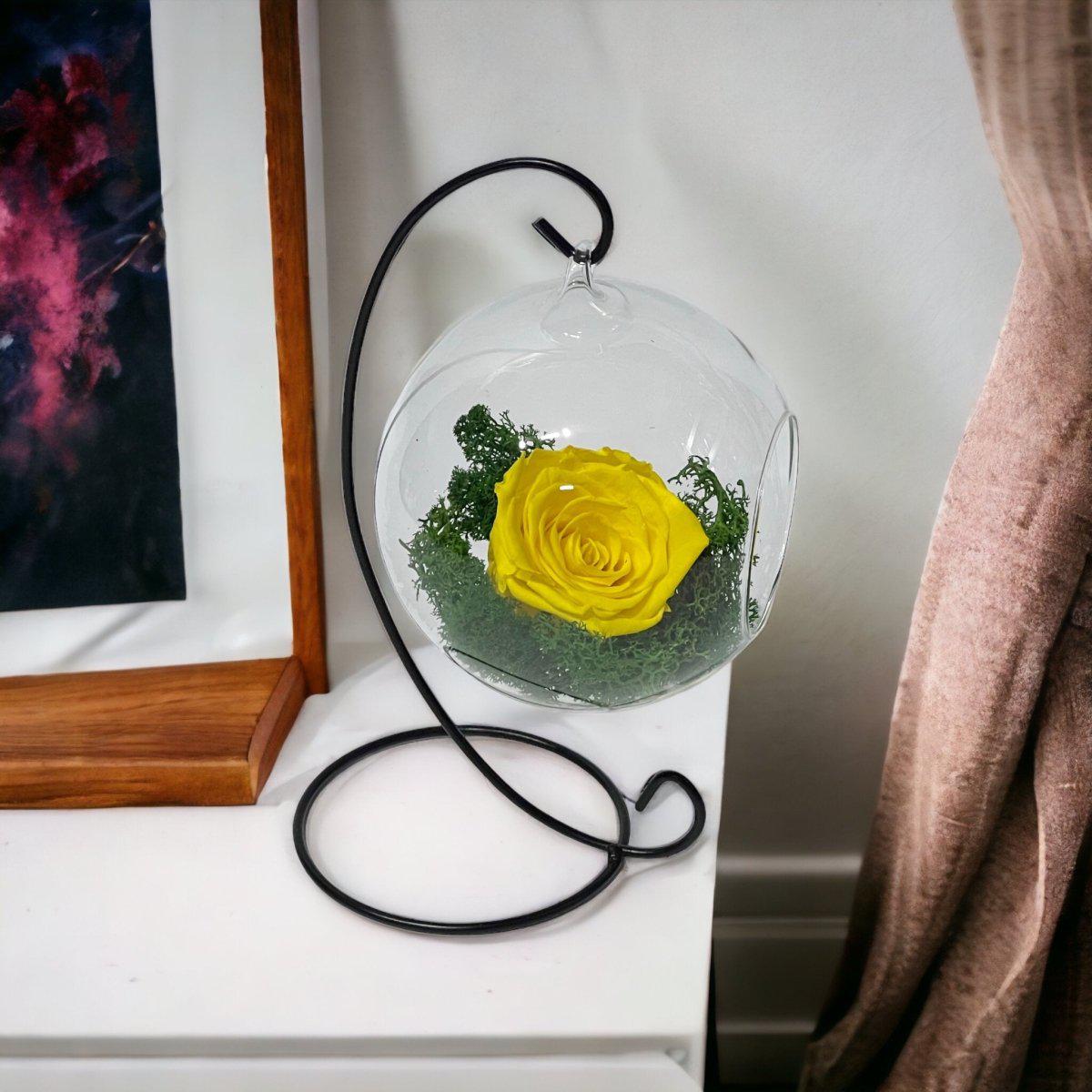 Trandafir criogenat galben XL în glob decorativ din sticlă, suspendat pe un picior metalic negru, oferă un rol decorativ în locuință sau în spațiul de lucru.