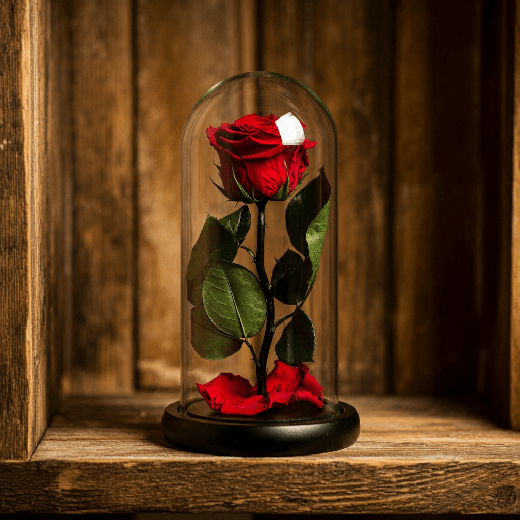 Foarte frumos trandafirul. Este un cadou dragut. (Personal m-am intrebat daca ar putea fi fixata cupola de sticla permanent de baza pentru a putea fii manevrata mai usor dar este frumos si asa)